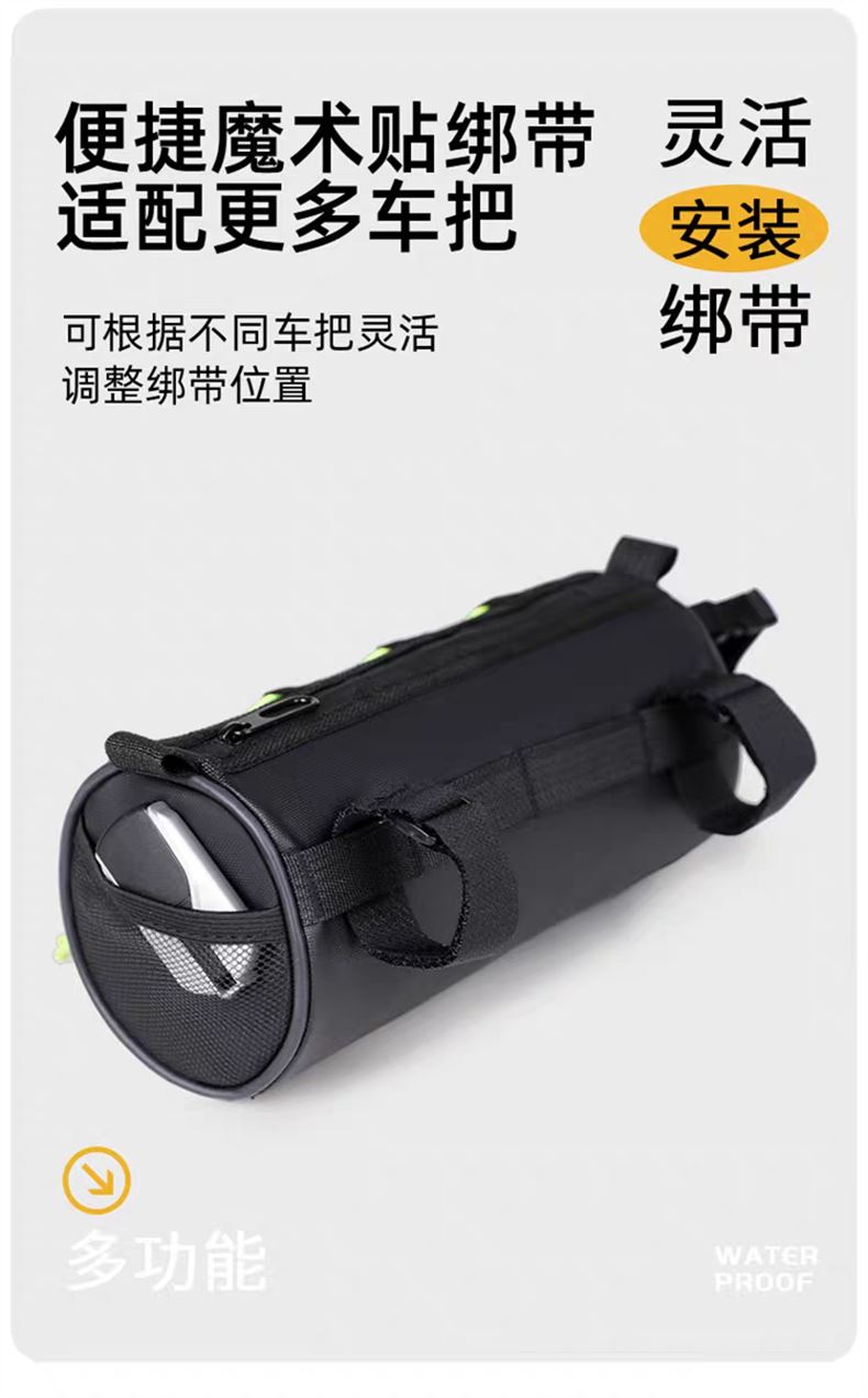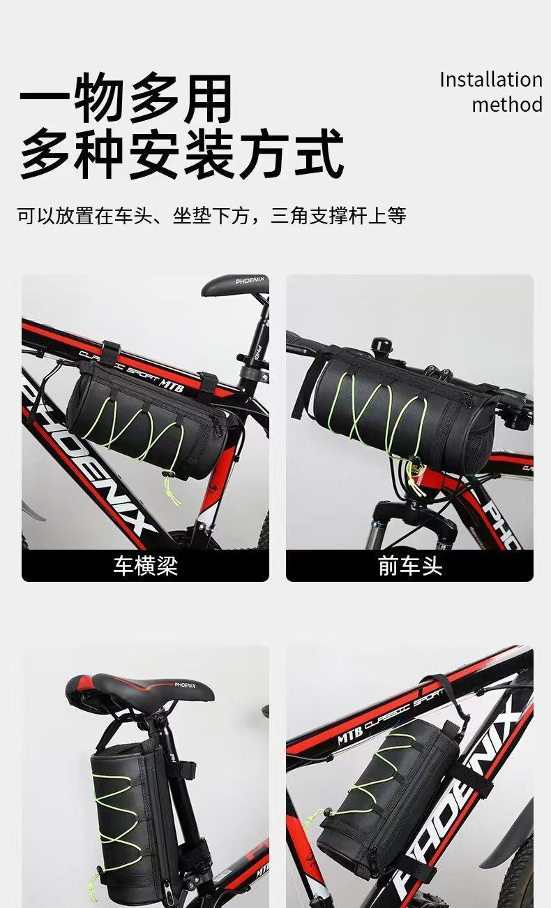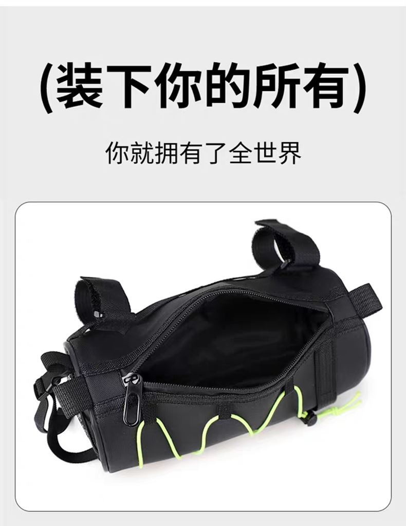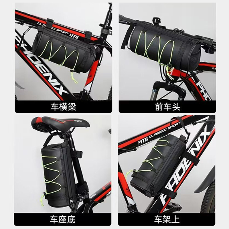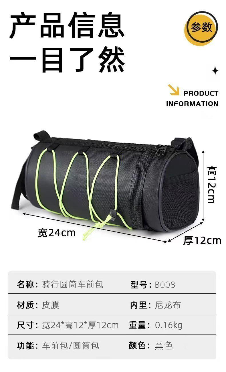 材质 皮膜+尼龙布 颜色 黑色 尺寸 24*12*12cm (测量方法不同,可能存在1-3cm误差,实际尺寸以实物为准) 重量 0.16kg 圆桶形经典设计,容量利用率高,符合骑行装备潮流 专为骑行设计, 满足骑行时所需携带物品 适配车横梁、前车头、车底座、车架等不同位置的安装 轻量化、耐磨、防泼水涂层,是骑行包的理想选择 表面弹力交叉绳,可压缩包体,防止物品晃动,提升骑行稳定性