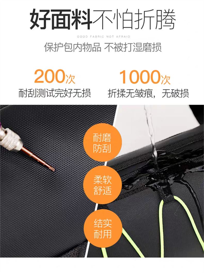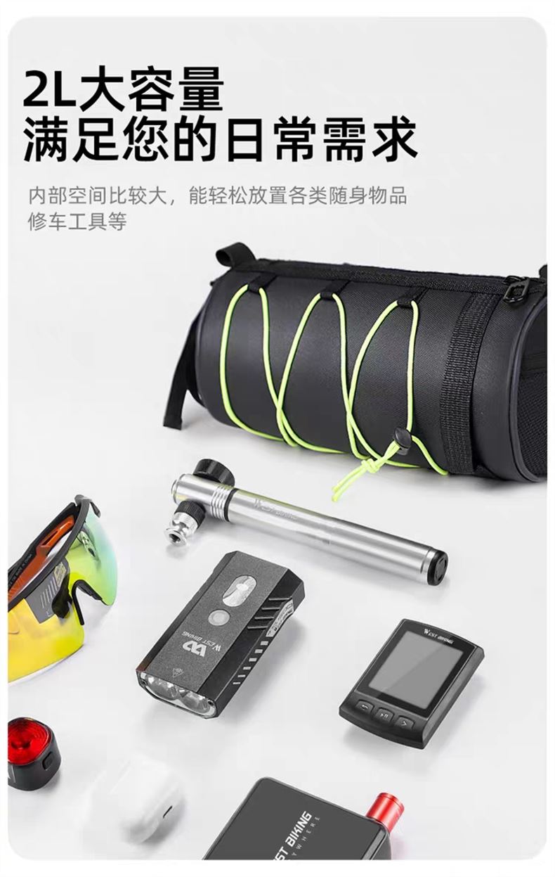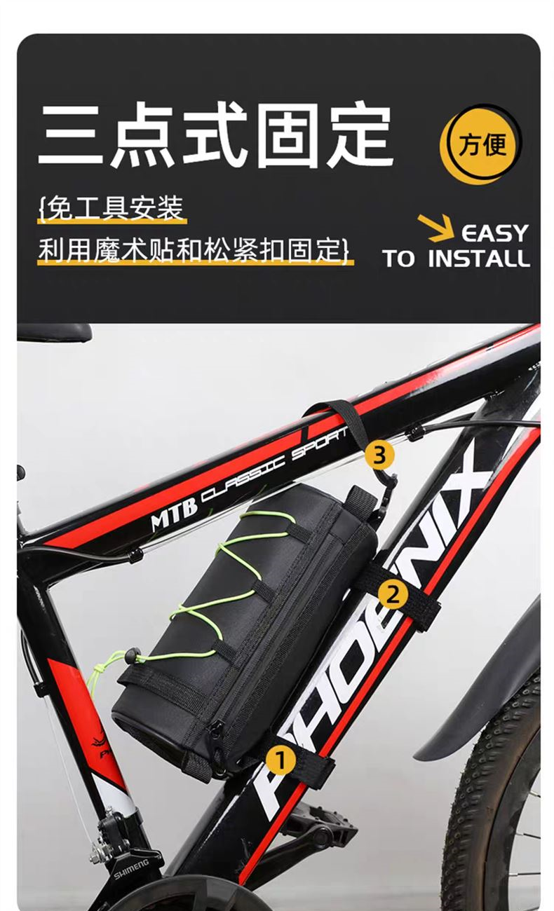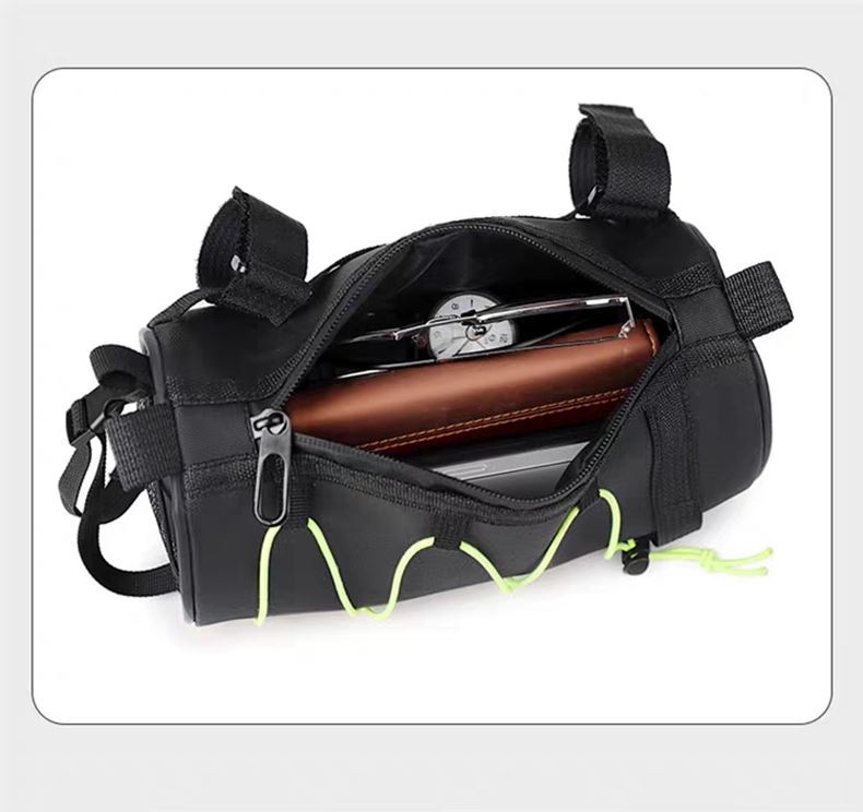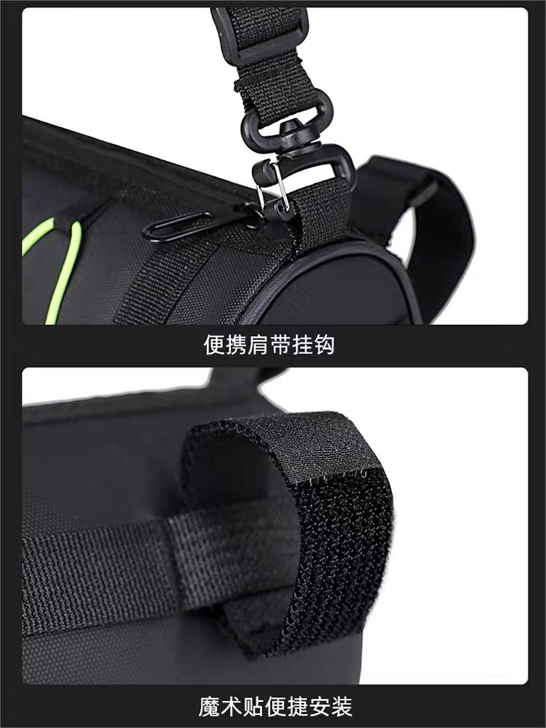 材质 皮膜+尼龙布 颜色 黑色 尺寸 24*12*12cm (测量方法不同,可能存在1-3cm误差,实际尺寸以实物为准) 重量 0.16kg 圆桶形经典设计,容量利用率高,符合骑行装备潮流 专为骑行设计, 满足骑行时所需携带物品 适配车横梁、前车头、车底座、车架等不同位置的安装 轻量化、耐磨、防泼水涂层,是骑行包的理想选择 表面弹力交叉绳,可压缩包体,防止物品晃动,提升骑行稳定性